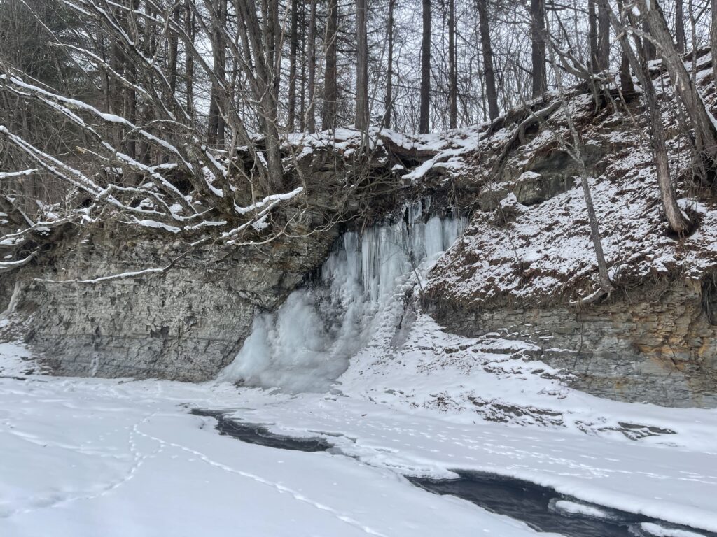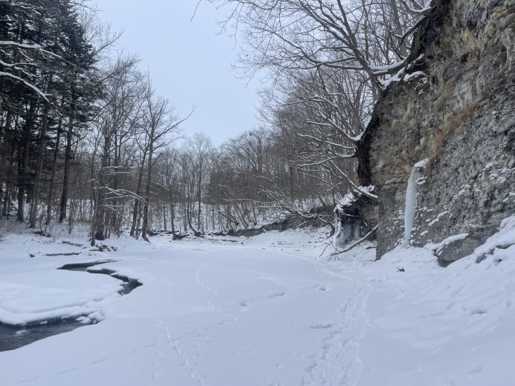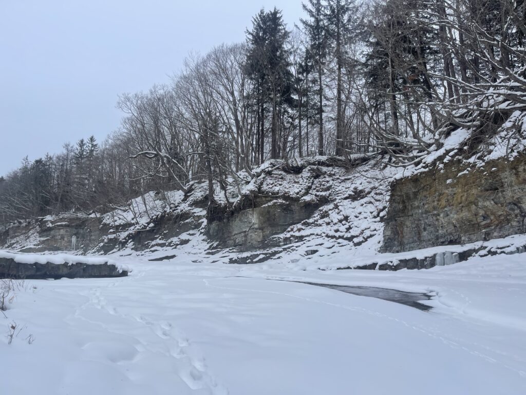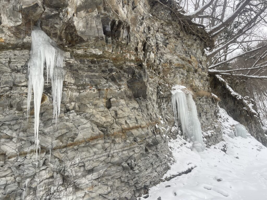 河岸のオシラネップ川層の露頭には地下水が滲み出てできた美しい氷瀑の姿も見ることができます。