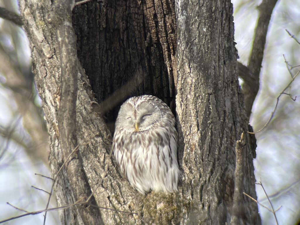 車で10分ほどの町内のある場所に、フクロウが休んでいる木があります。このようなアクセスしやすいフクロウのいるうろのある木がもう1本あったのですが、強風の日に折れてしまいました。もう1本、フクロウが入る一番近い所にある木がありますが最近は入っていないようです。この木は同じく木のうろで繁殖するカモのなかまのカワアイサが入っている年もありました。