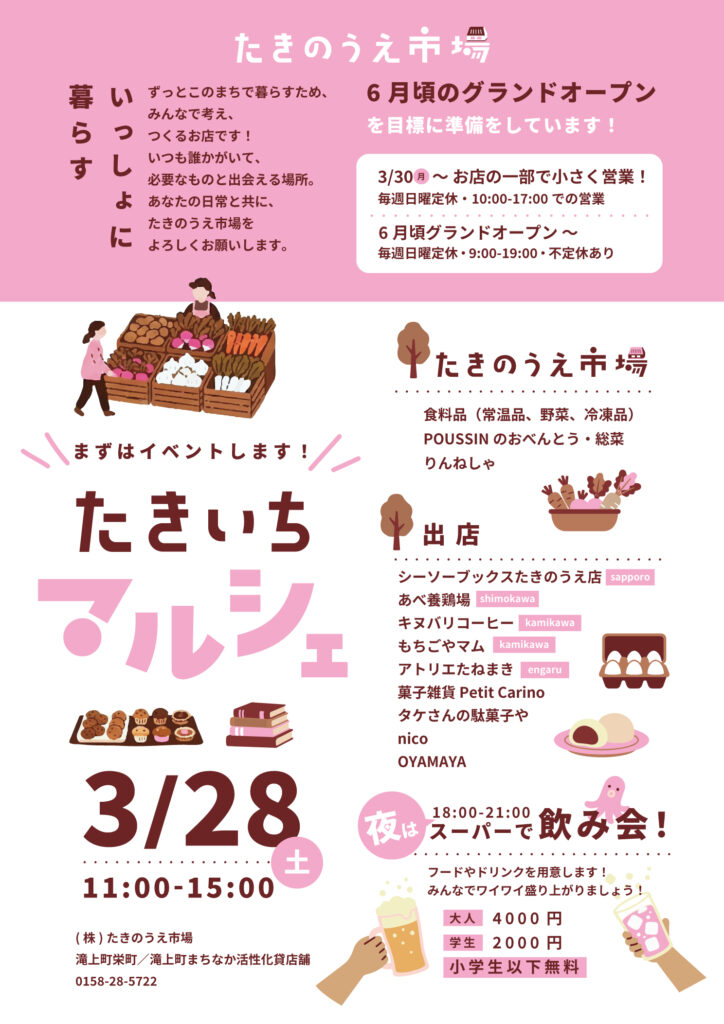 3月28日(土)『たきいちマルシェ』を開催いたします。楽しい催しとなるよう準備を進めています。皆さまどうぞ遊びにきてください。