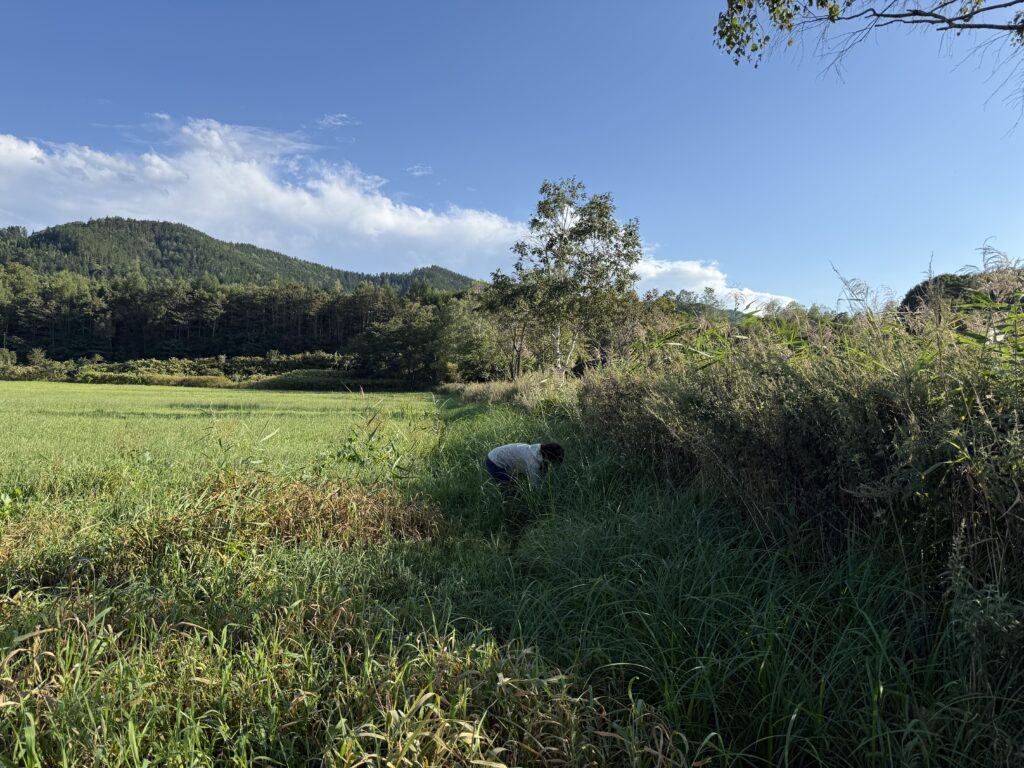 滝上町産のスゲは井上牧場様のご協力で刈らせていただきました。下の写真が自生しているスゲの刈り取りの様子です。