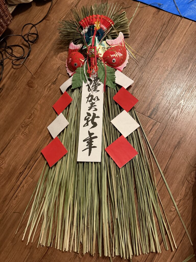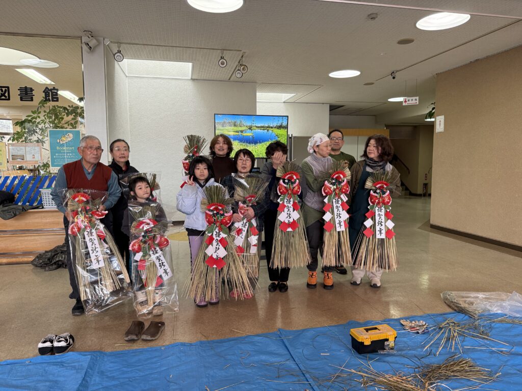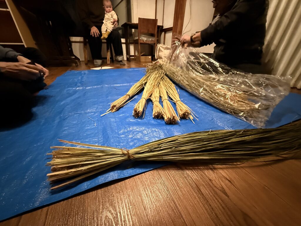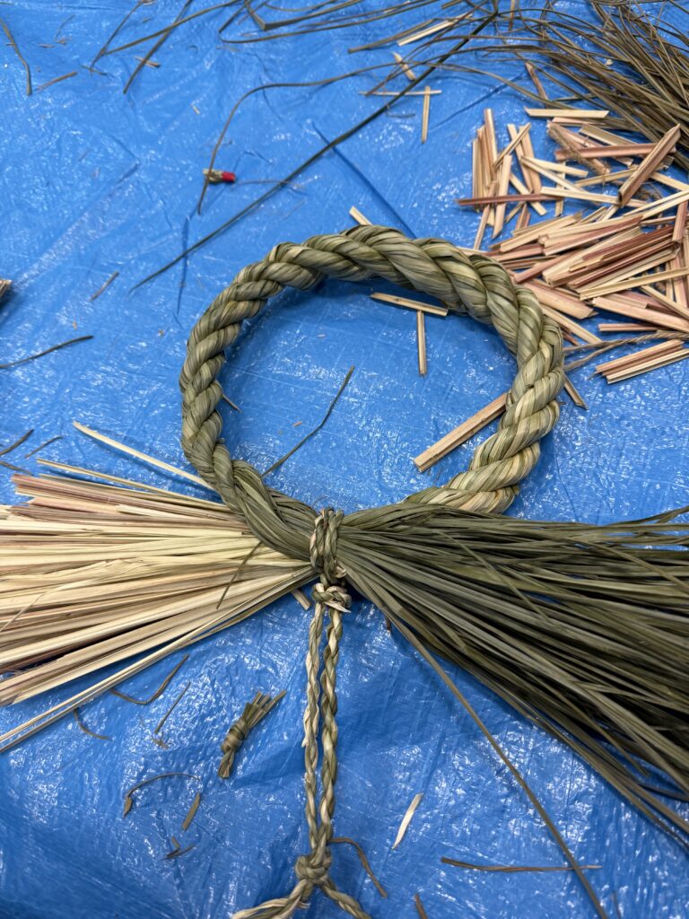 今年は滝上町産のスゲも使って作成することができました。手前の横になっているのが滝上町産のスゲです。ワークショップ参加の皆様にはしめ縄の『頭』の部分に滝上のスゲを使ってもらいました。『頭』とはしめ縄(お正月飾り)の上の丸くなっている部分です。(下の写真)