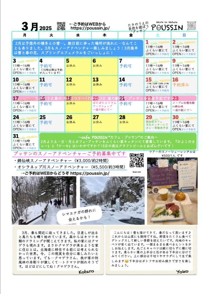 また、5月中はカフェ・プッサンの営業のため自然ガイドは4月までにお受けした予約のみ実施させていただいております。6月よりいよいよ浮島湿原ガイドが最盛期を迎えます。6月以降につきましては通常通り予約をお受け致しておりますのでお待ちしております。