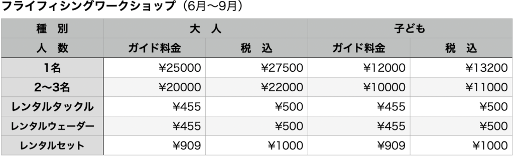 - 体験時に消費したフライ以外の釣行に必要な消耗品(リーダー等)については実費で請求させていただきます